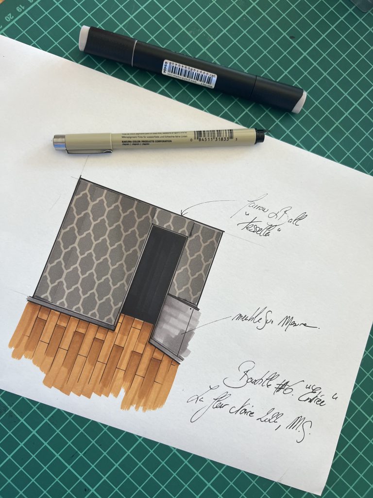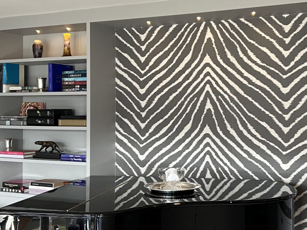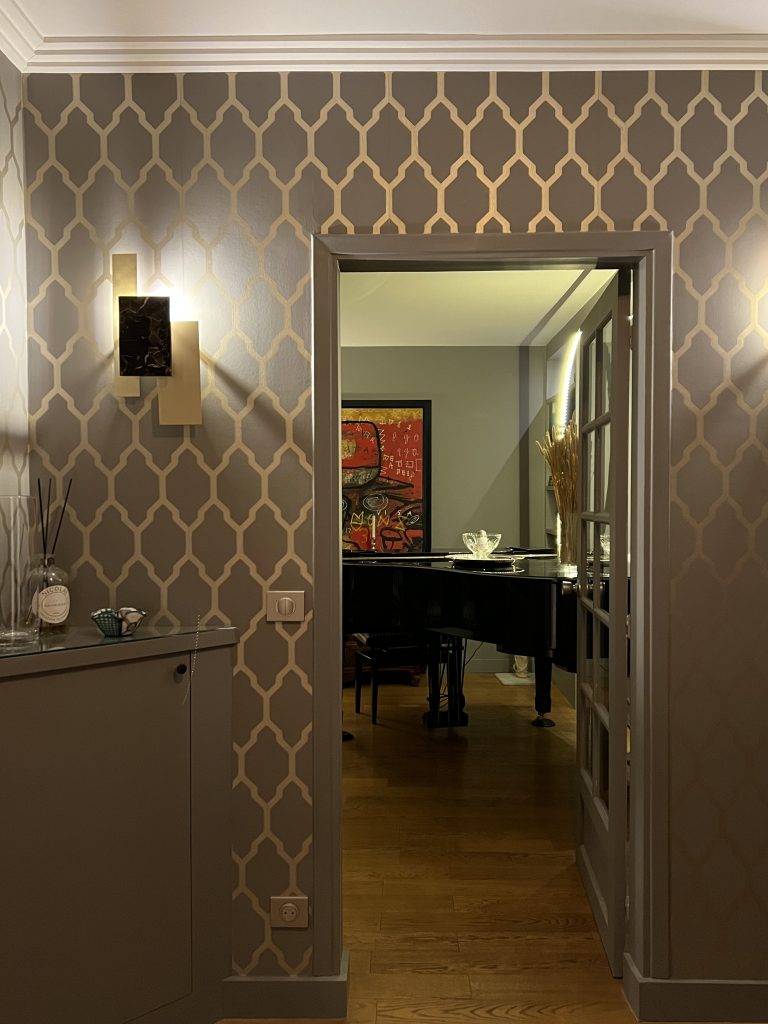 Le projet s’articule autour d’un travail sur mesure, intégrant mobilier dessiné spécifiquement pour les lieux, ainsi qu’une sélection raffinée de papiers peints et de tissus. La palette, dominée par des nuances de gris, crée une atmosphère douce et enveloppante, rehaussée par des matières chaleureuses et des détails soignés.